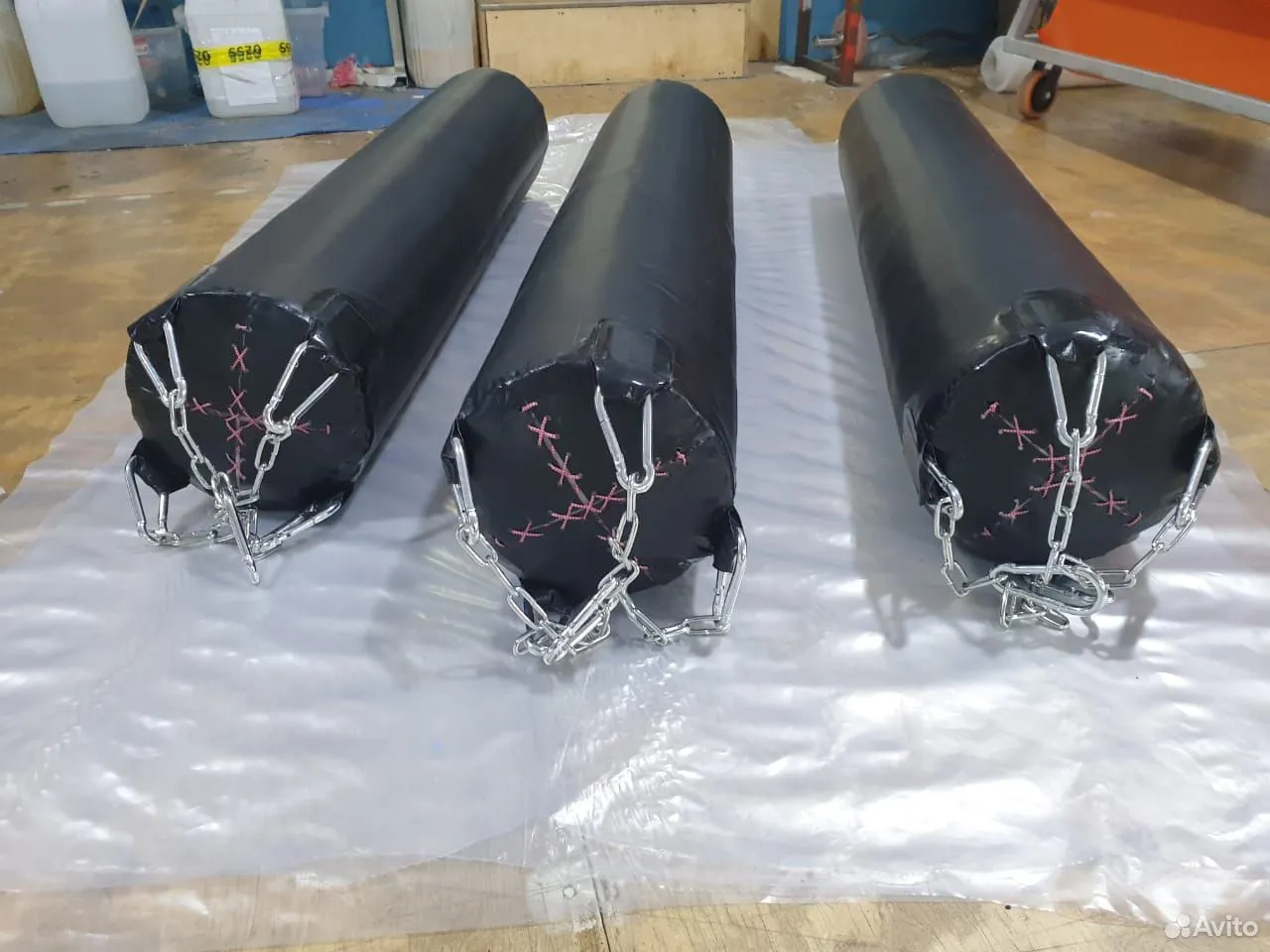 Мешки боксерские подвесные под крутящуюся подвеску, высотой от 1 до 2 м, весом от 20 до 80 кг. Набивка - текстиль резиновая крошка (варианты - из тентовой ткани либо натуральной кожи)